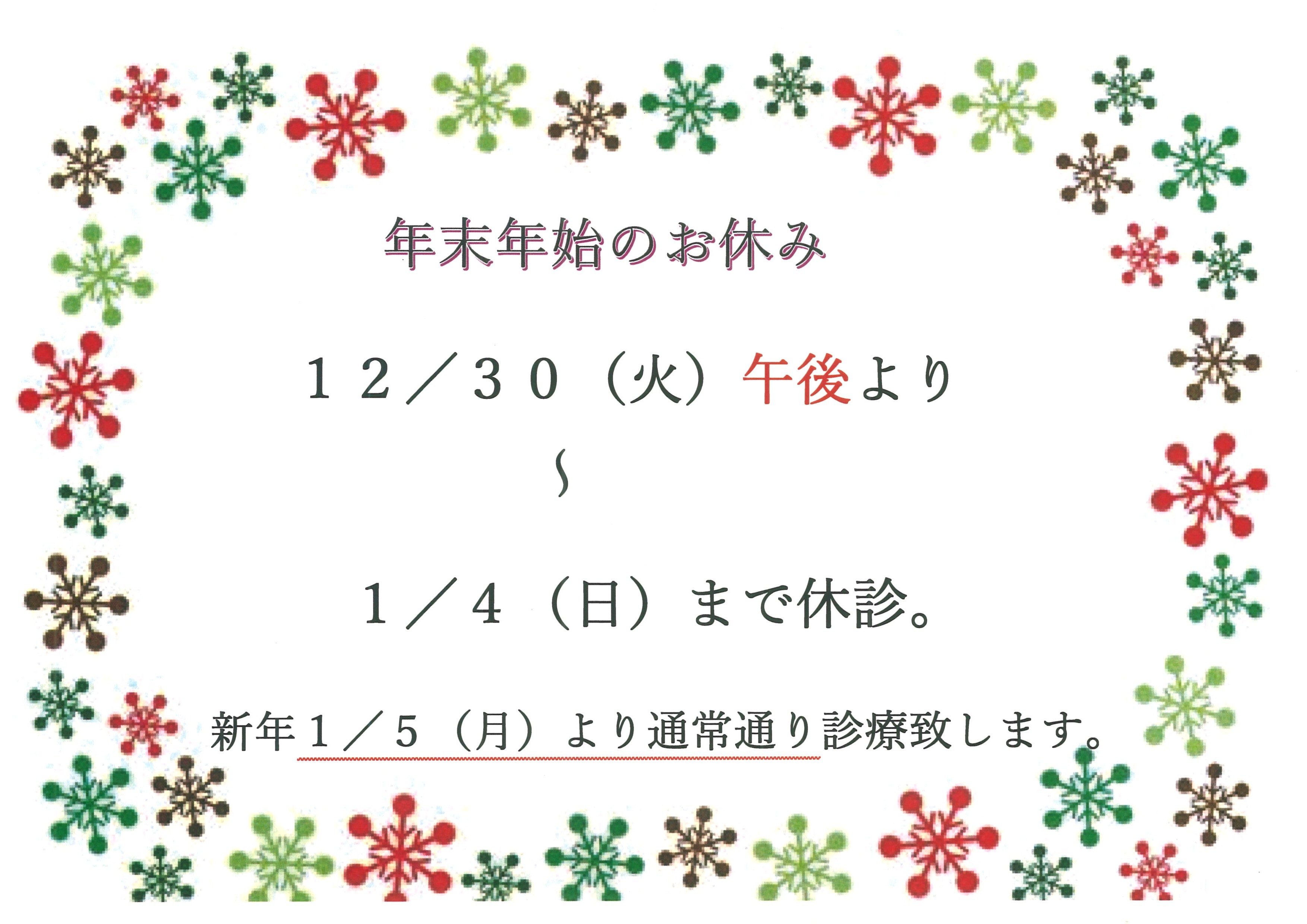 年末年始は、12/30(火)午後〜1/4(日)まで休診とさせて頂きます。