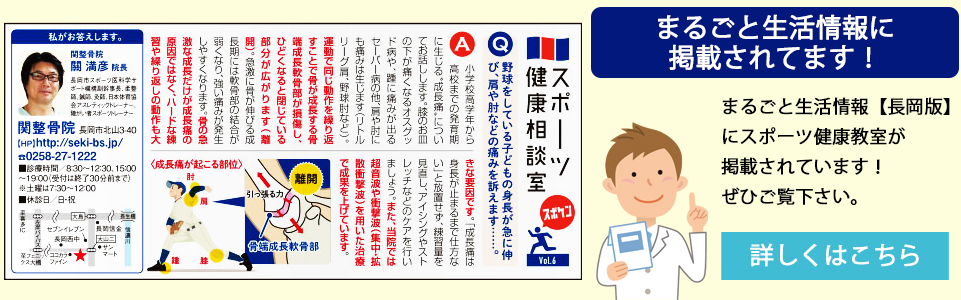 新潟県長岡市の関整骨院です。整骨院・鍼灸院・カイロテクニック・スポーツトレーナーの分野から総合的にベストな治療を提供します。スポーツ外傷・顎関節症・交通事故の治療・産後の骨盤矯正などなかなか良くならない、とお悩みの方、あきらめずにご来院下さい