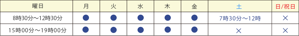 土曜日の午後・日曜日と祭日 ※受付は終了30分前までにお越し下さい。